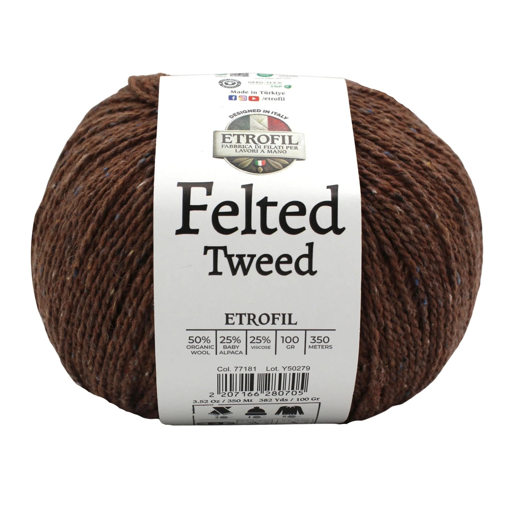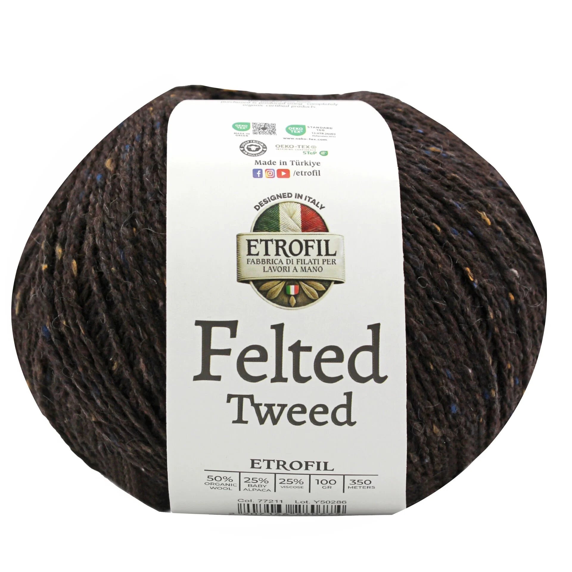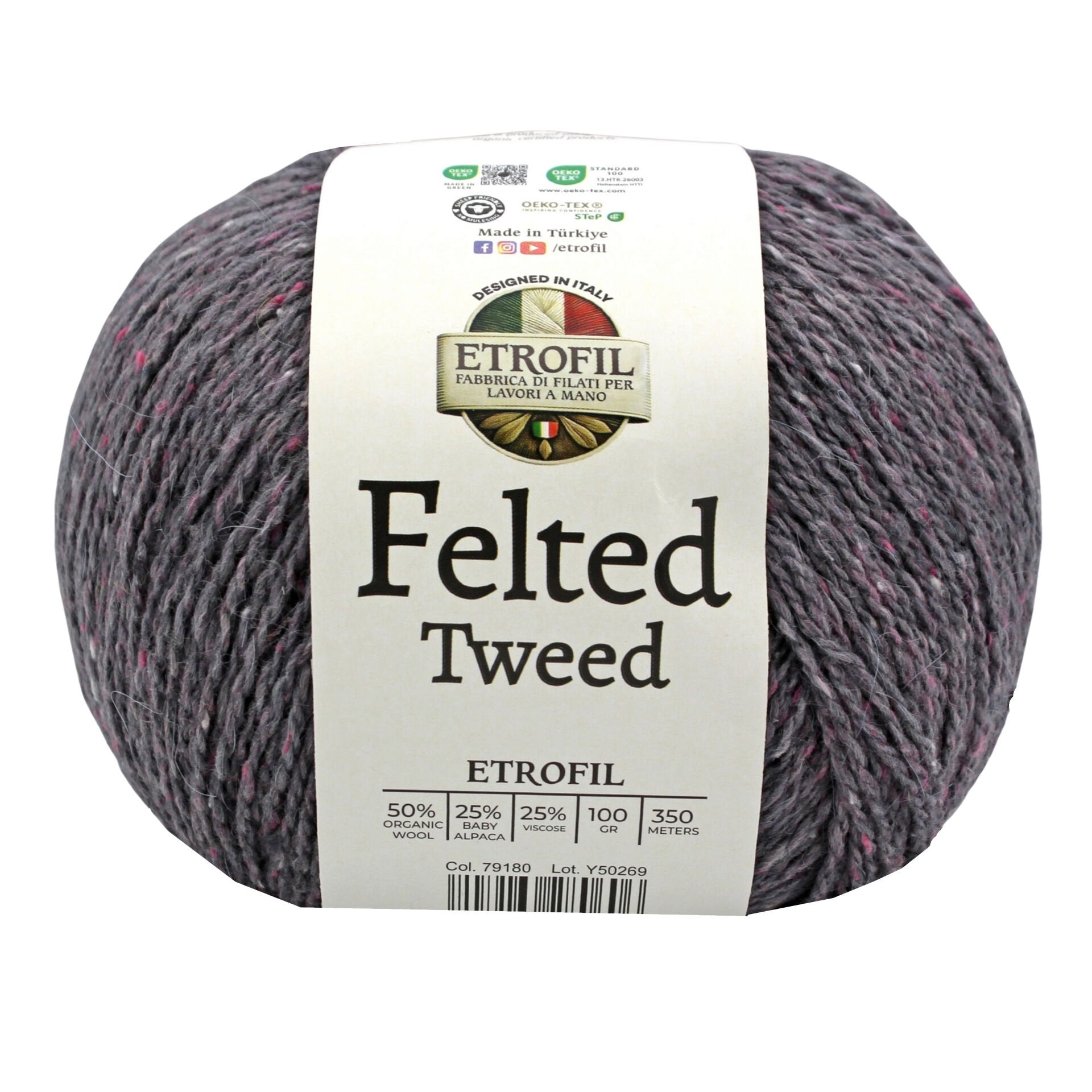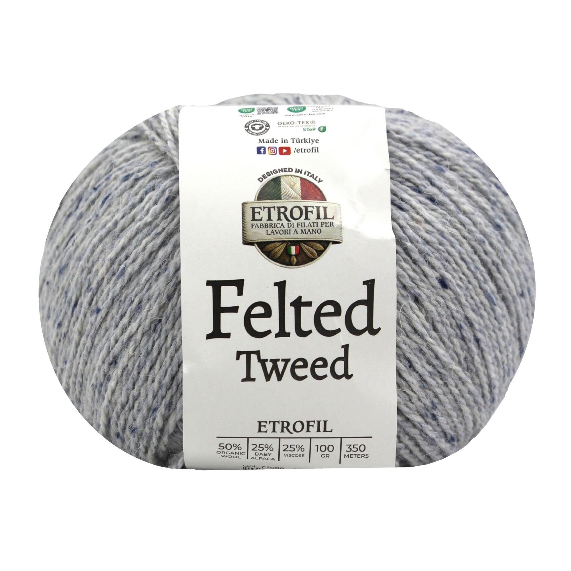 Etrofil Felted Tweed is een hoogwaardige tweedgaren geïnspireerd door de natuur. De combinatie van organische merinowol, baby alpaca en viscose zorgt voor een zachte, lichte en ademende structuur met een elegante valling.