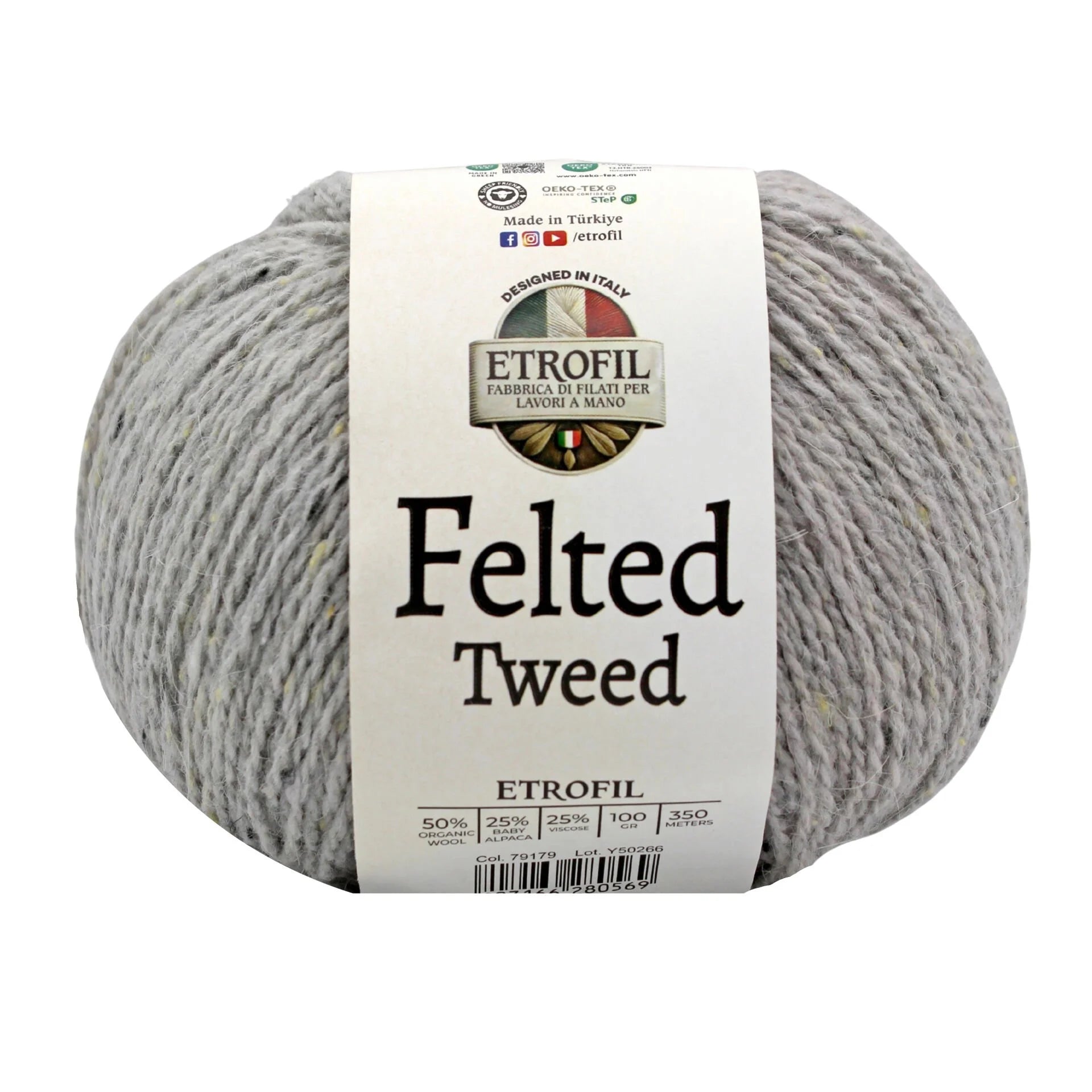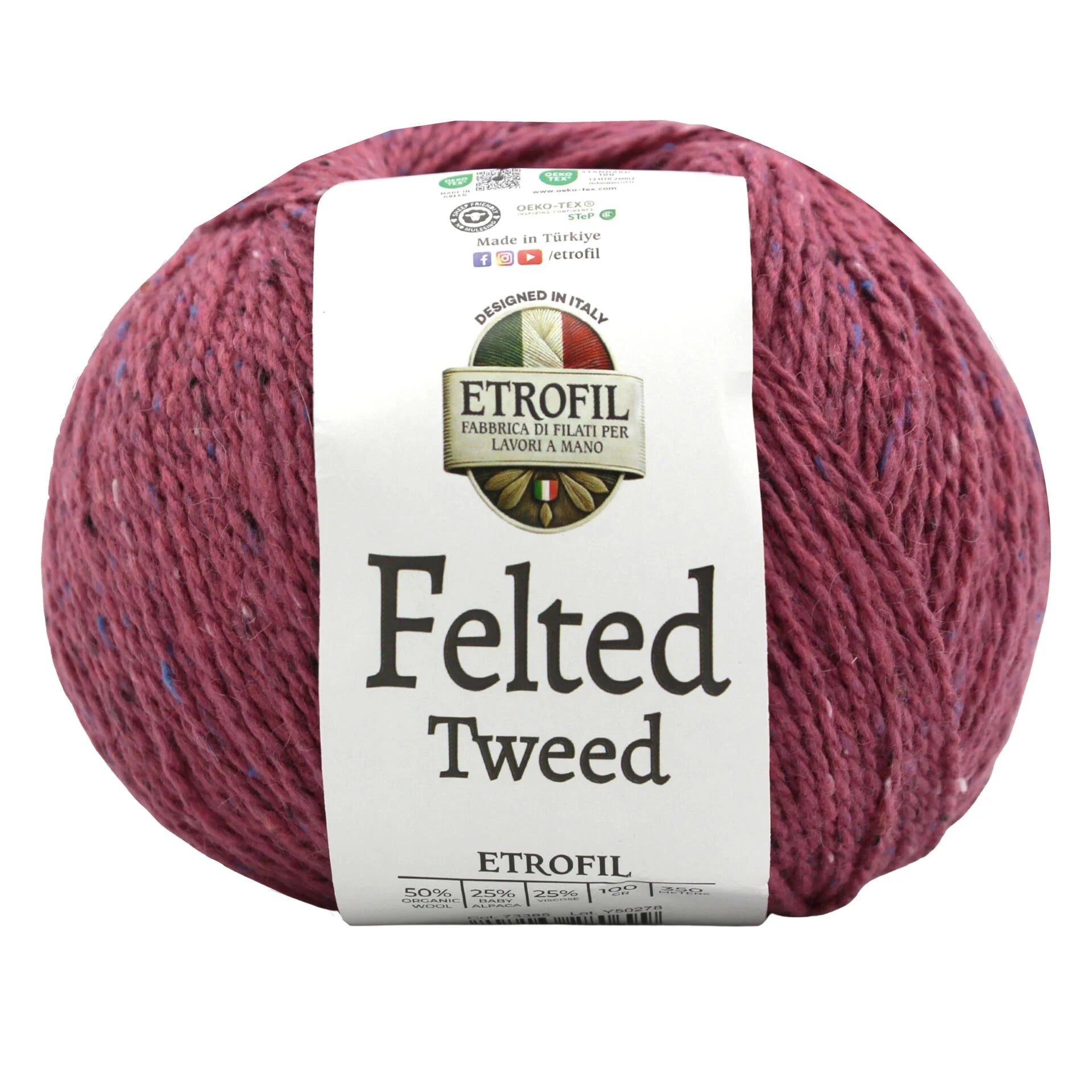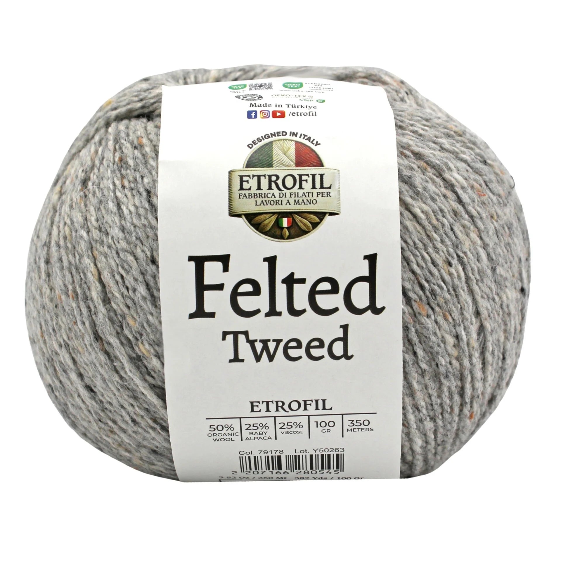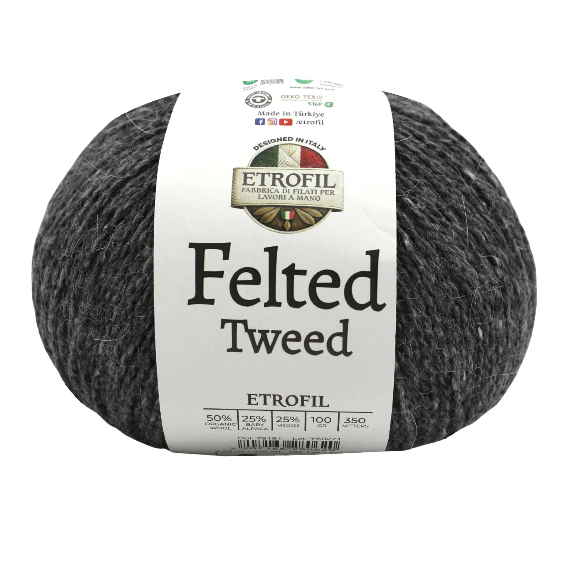 Etrofil Felted Tweed is een hoogwaardige tweedgaren geïnspireerd door de natuur. De combinatie van organische merinowol, baby alpaca en viscose zorgt voor een zachte, lichte en ademende structuur met een elegante valling.