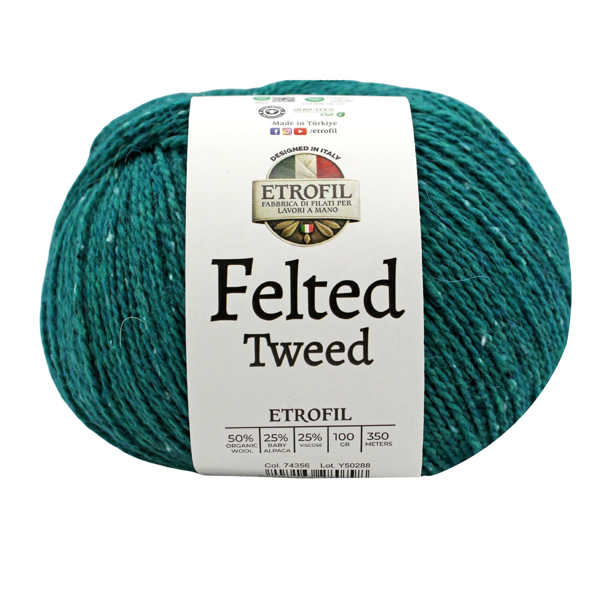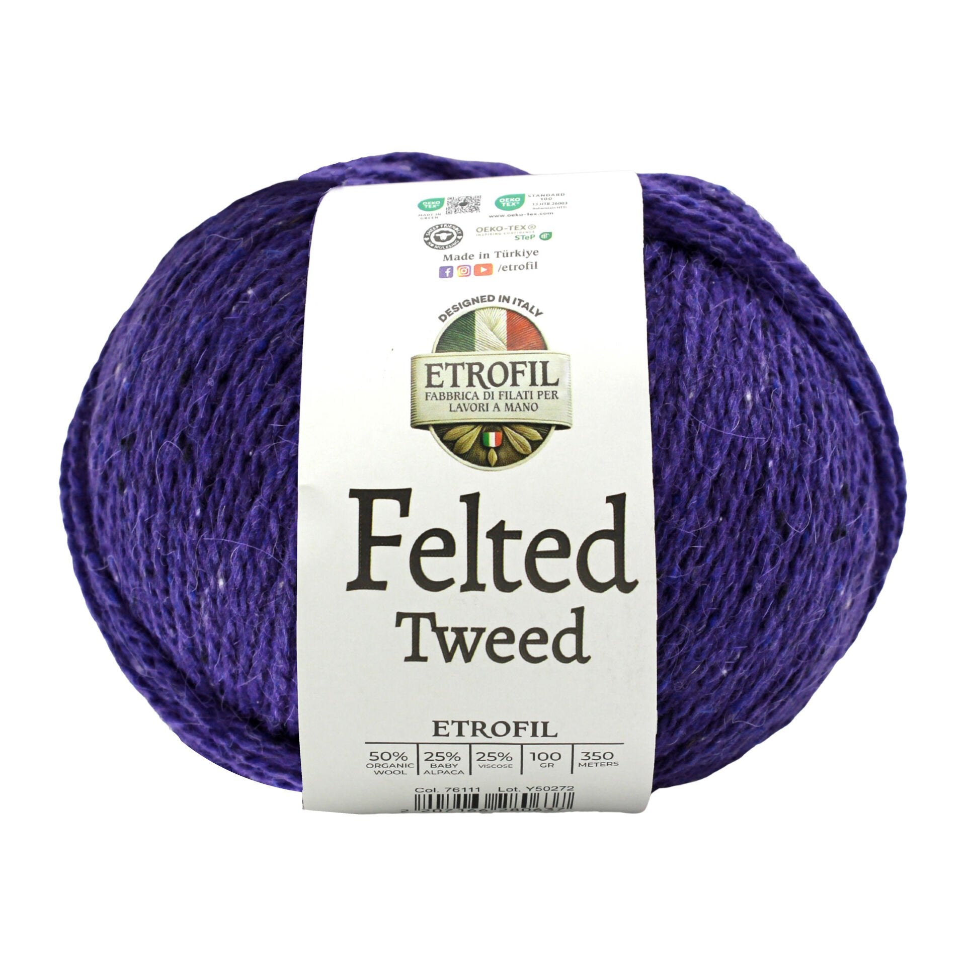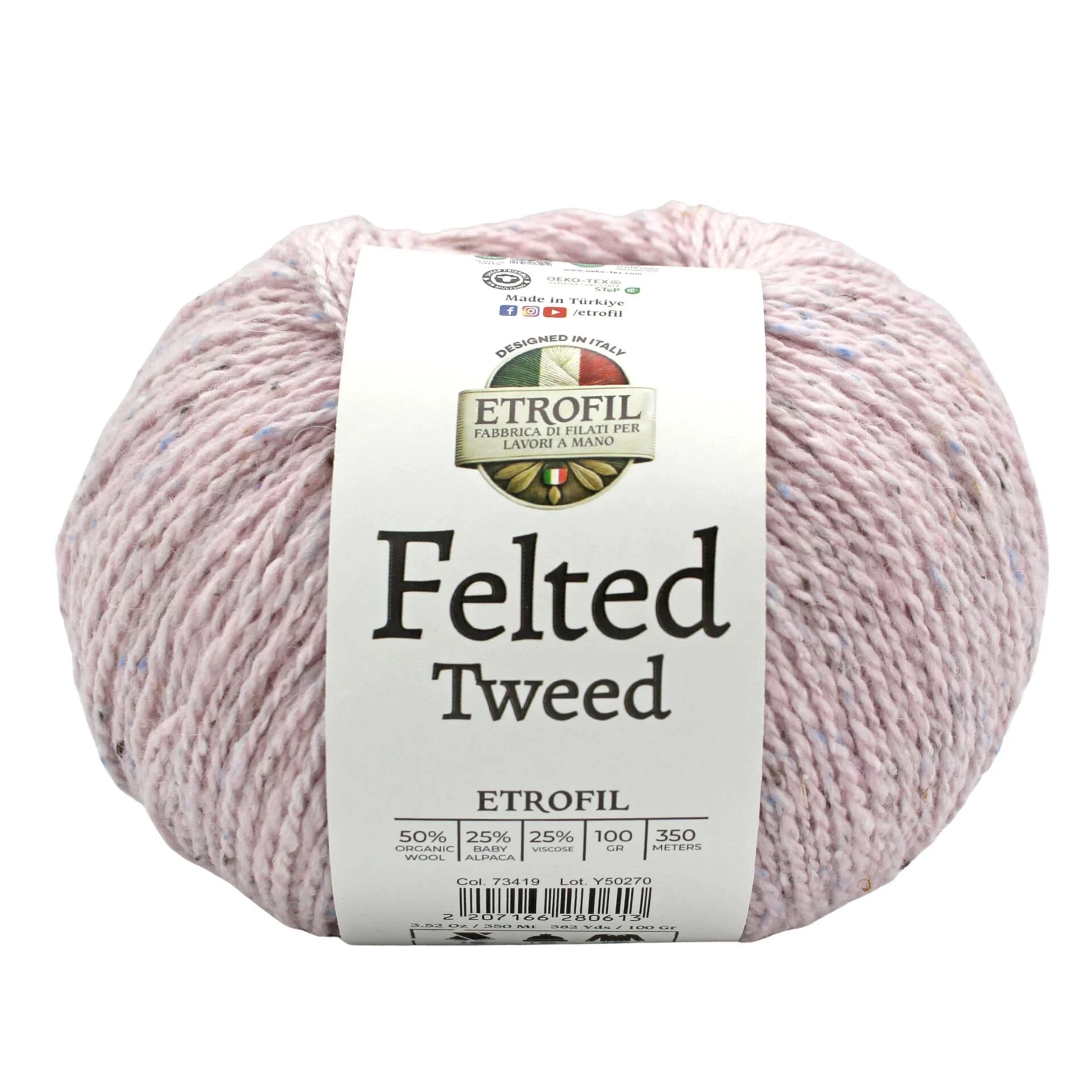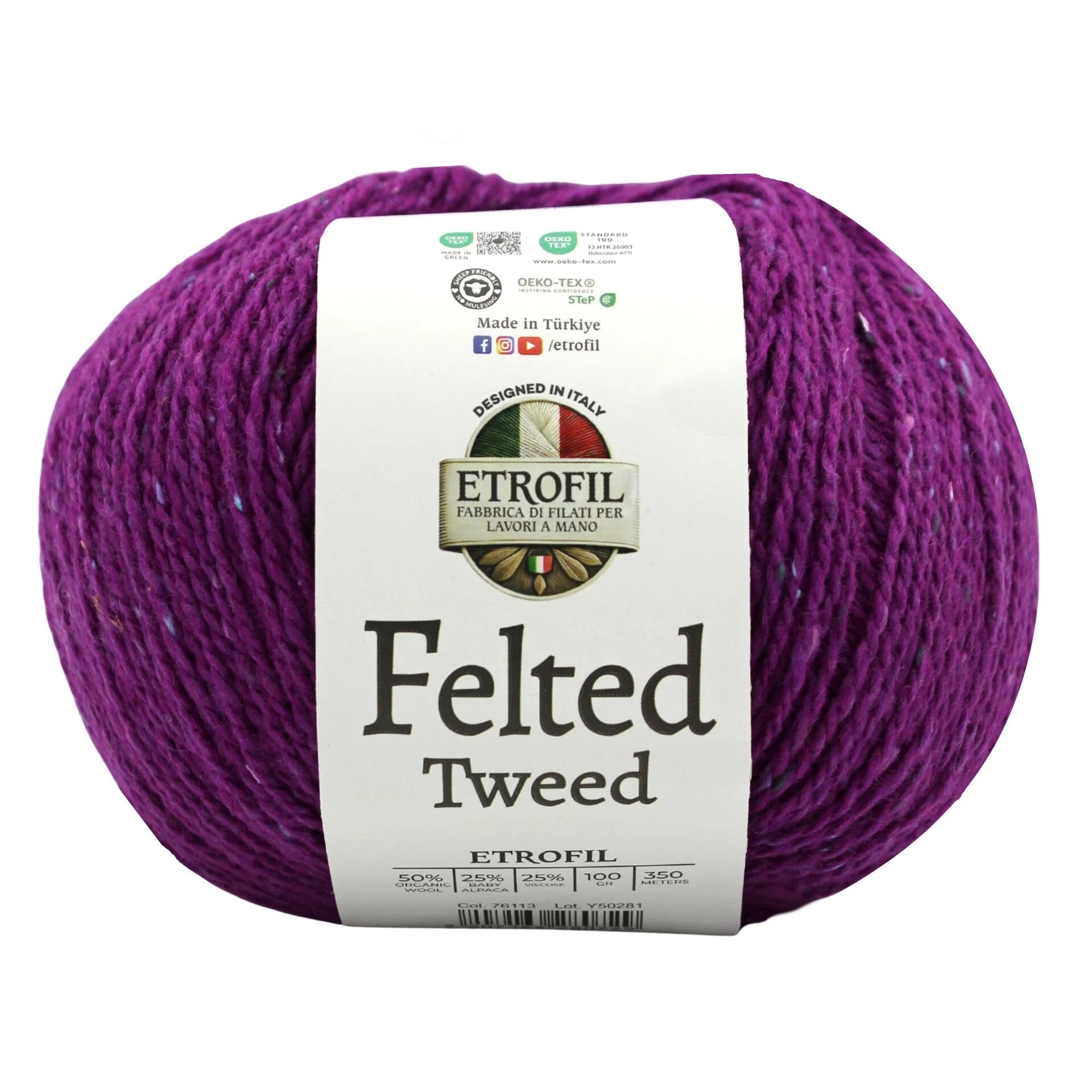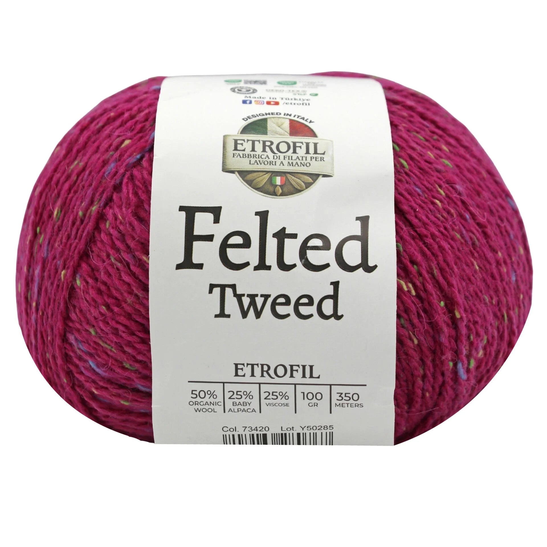 Etrofil Felted Tweed is een hoogwaardige tweedgaren geïnspireerd door de natuur. De combinatie van organische merinowol, baby alpaca en viscose zorgt voor een zachte, lichte en ademende structuur met een elegante valling.