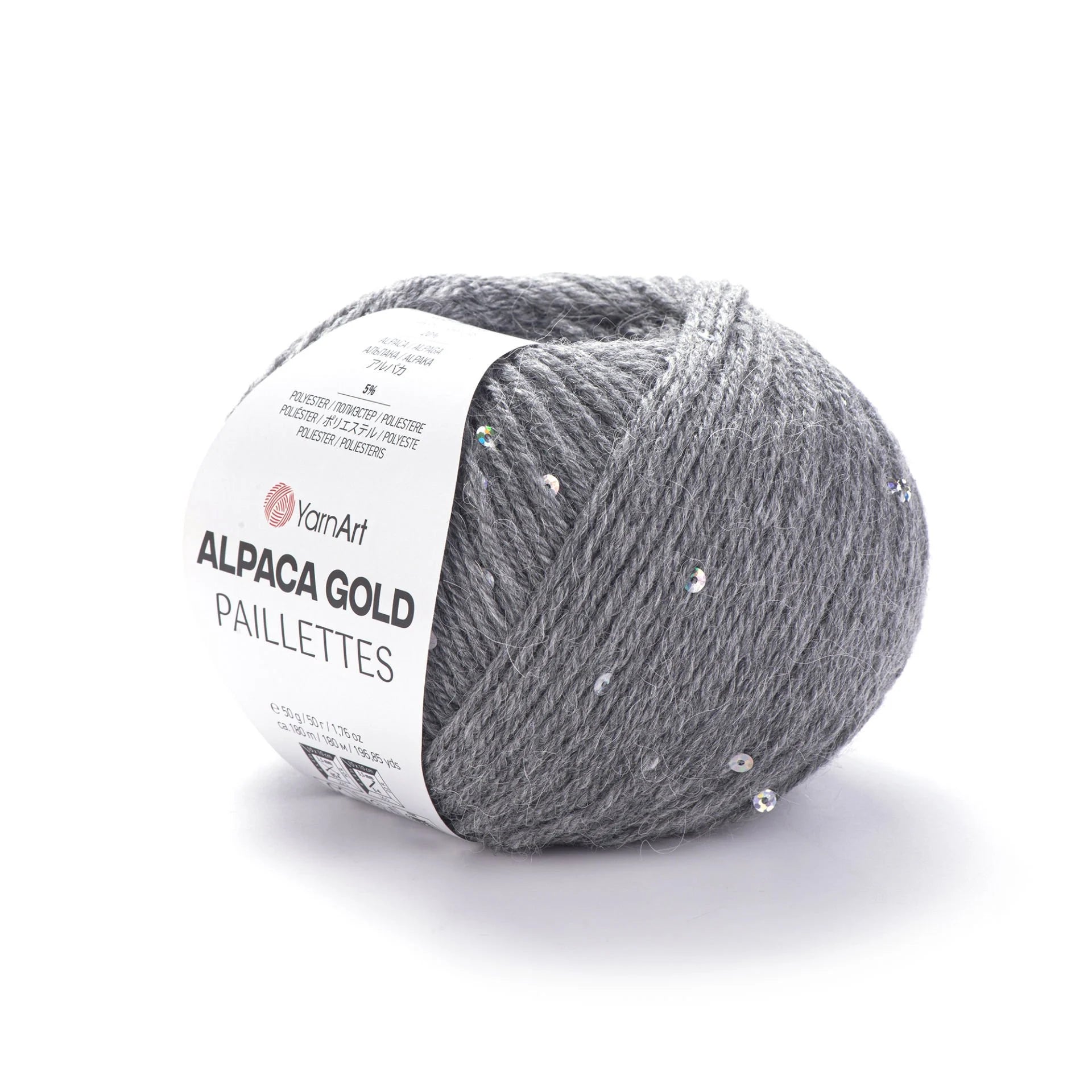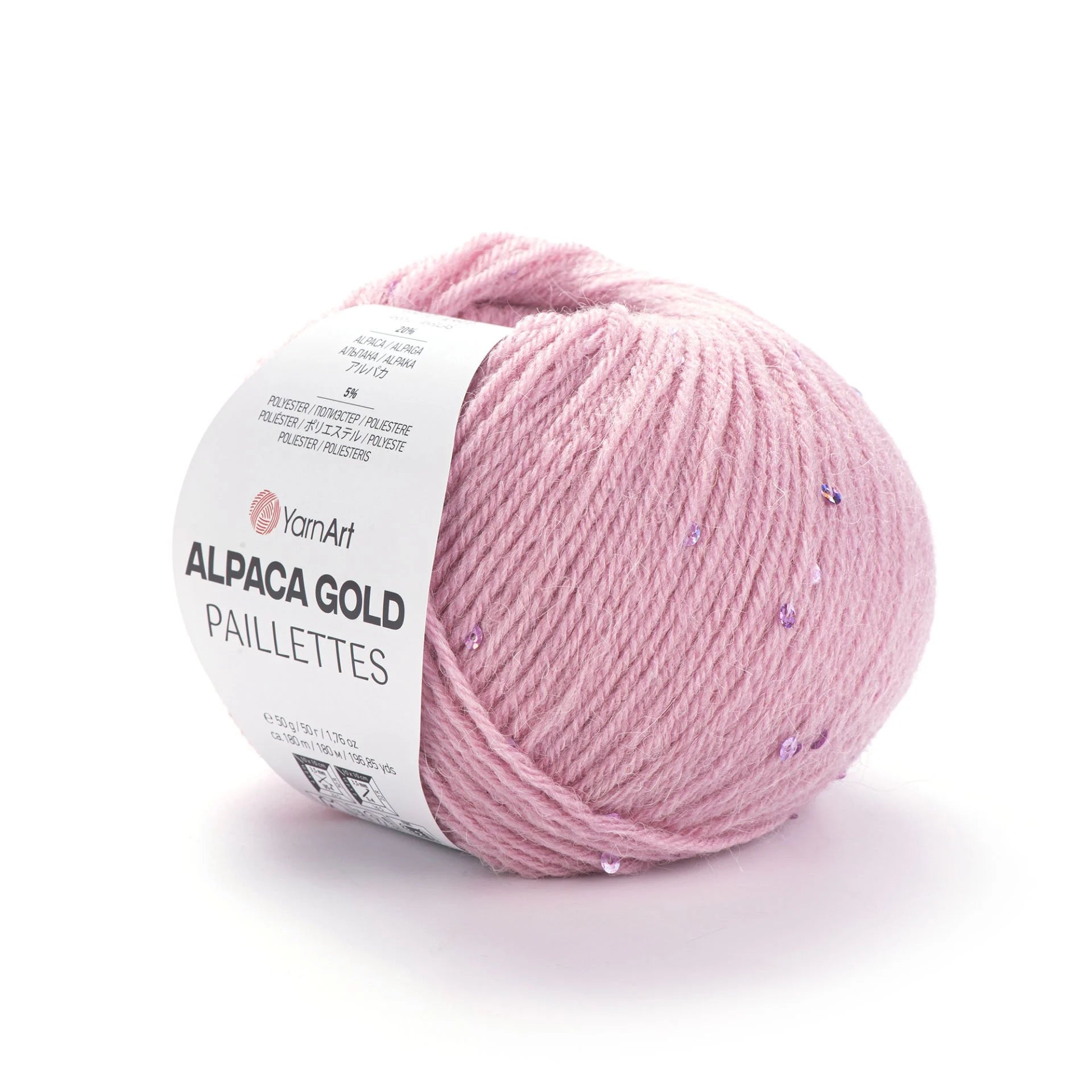 YarnArt Alpaca Gold Paillettes is a fine, luxurious yarn blending 20% alpaca, 5% polyester (for sequins), and 75% acrylic. Each 50 g ball includes approximately 180 m (197 yds) of softly textured, shimmering yarn—perfect for adding elegance and warmth to your creations.