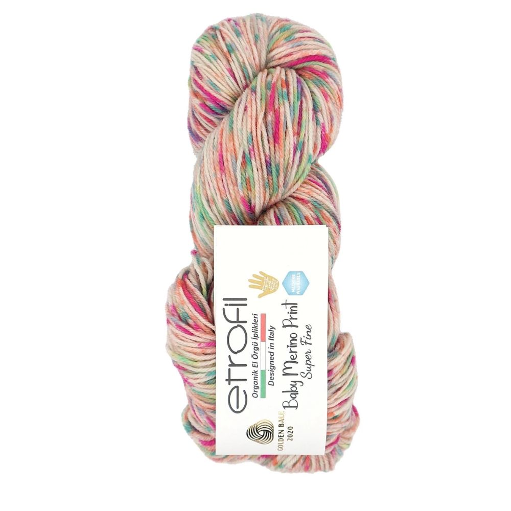 Etrofil Baby Merino Print is a luxuriously soft and breathable yarn crafted from 100% organic superwash merino wool. Each 50 g skein offers 200 m (218 yds) of fine, gently machine-washable yarn, making it ideal for delicate baby garments, cozy sweaters, shawls, and colorful accessories. With its vibrant hand-dyed variegated colors, this yarn brings both elegance and playfulness to your knit and crochet projects. Hypoallergenic and thermoregulating, it ensures comfort for even the most sensitive skin while delivering excellent stitch definition.