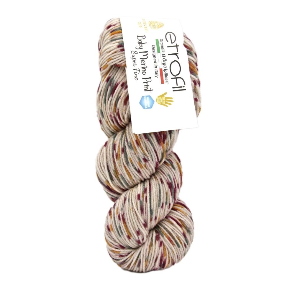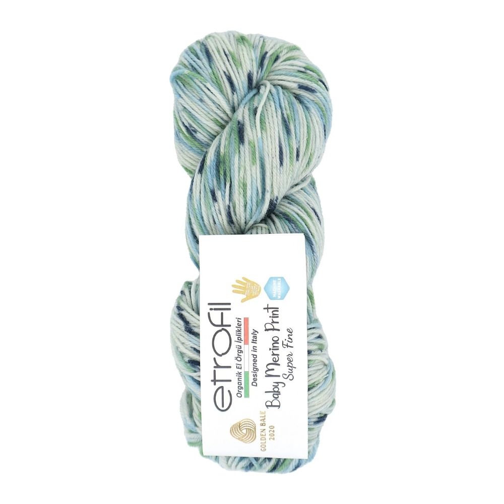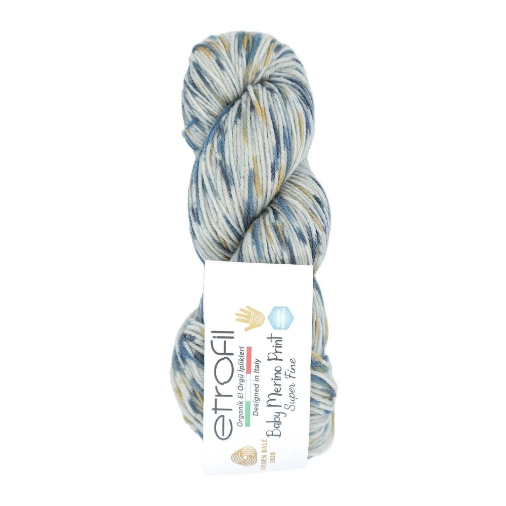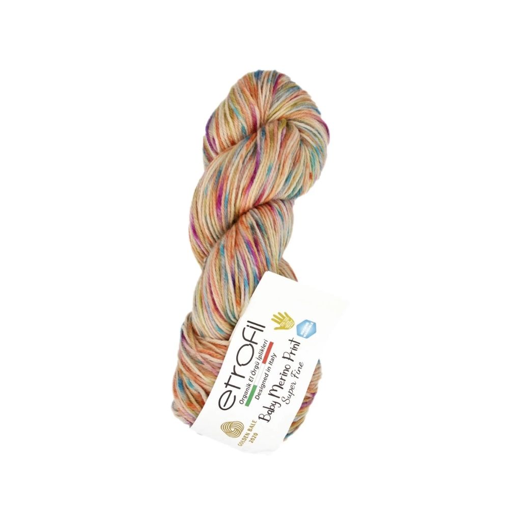 Etrofil Baby Merino Print is a luxuriously soft and breathable yarn crafted from 100% organic superwash merino wool. Each 50 g skein offers 200 m (218 yds) of fine, gently machine-washable yarn, making it ideal for delicate baby garments, cozy sweaters, shawls, and colorful accessories. With its vibrant hand-dyed variegated colors, this yarn brings both elegance and playfulness to your knit and crochet projects. Hypoallergenic and thermoregulating, it ensures comfort for even the most sensitive skin while delivering excellent stitch definition.
